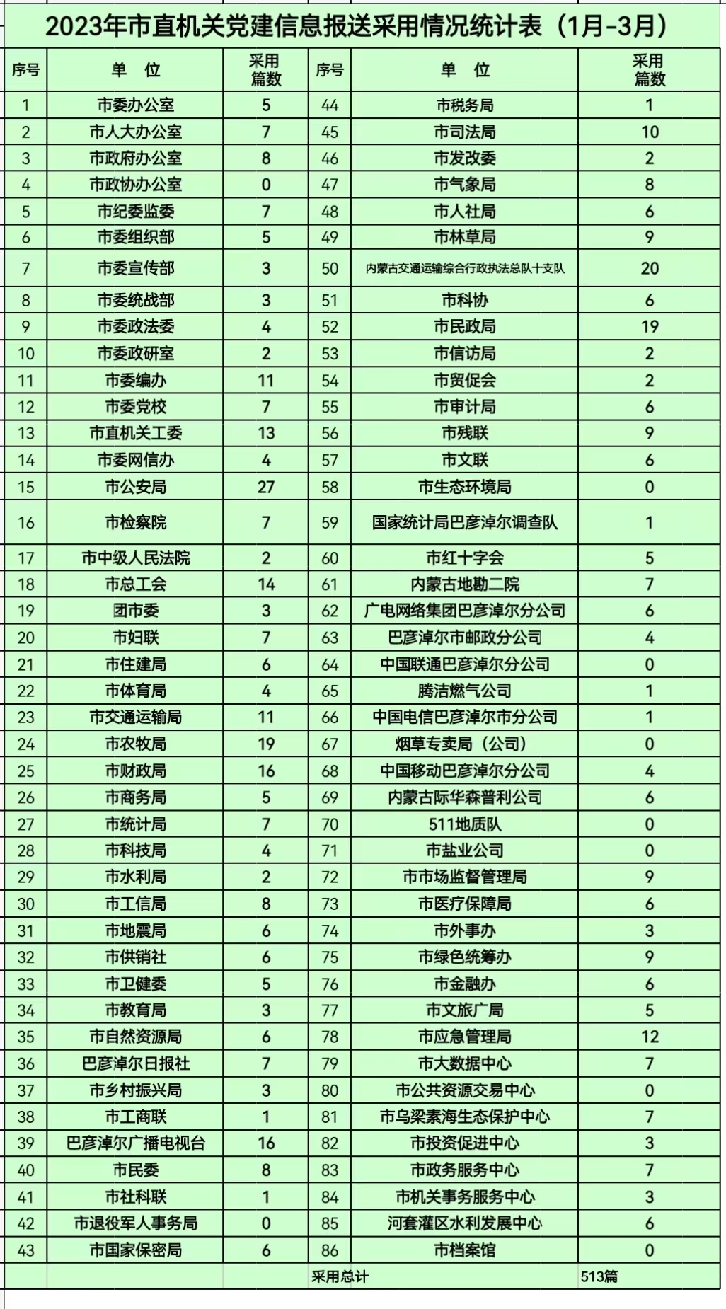 第一季度,巴彦淖尔机关党建网、微信公众号共采用信息513篇。