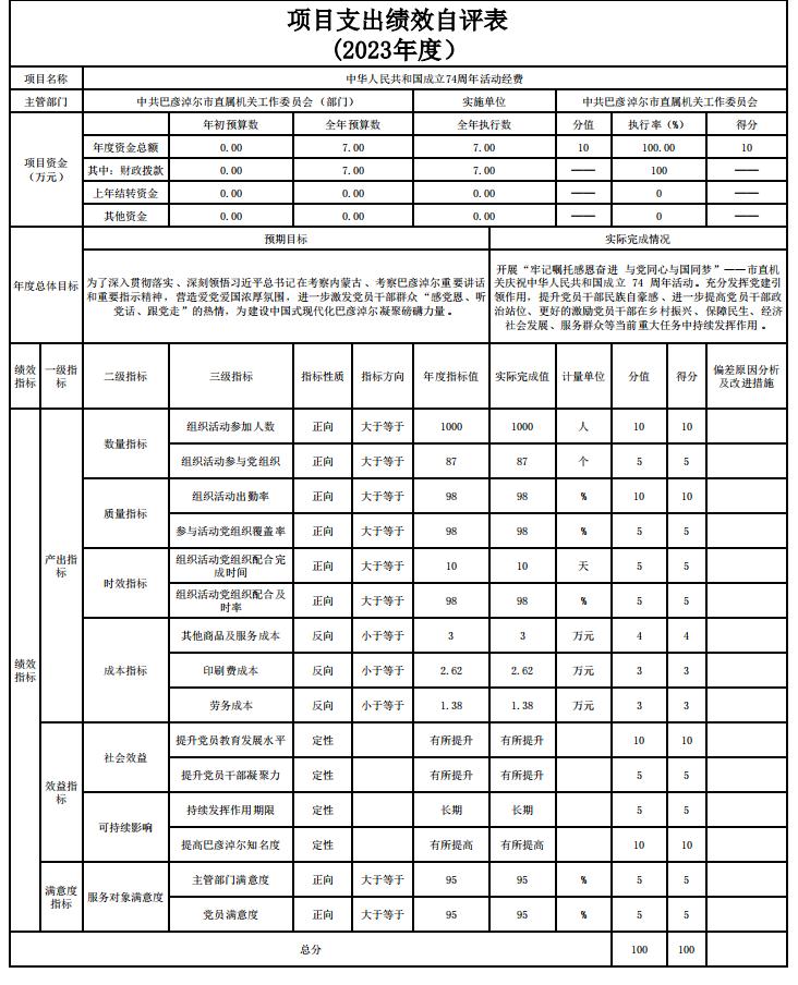 1、中华人民共和国成立74周年活动项目自评综述:根据年初设定的绩效目标,项目自评得分100分。全年预算数为7万元,执行数为7万元,完成预算的100%。项目绩效目标完成情况:开展“牢记嘱托感恩奋进 与党同心与国同梦”——市直机关庆祝中华人民共和国成立 74 周年活动。充分发挥党建引领作用,提升党员干部民族自豪感、进一步提高党员干部政治站位、更好的激励党员干部在乡村振兴、保障民生、经济社会发展、服务群众等当前重大任务中持续发挥作用。发现的主要问题及原因:无。下一步改进措施:无。