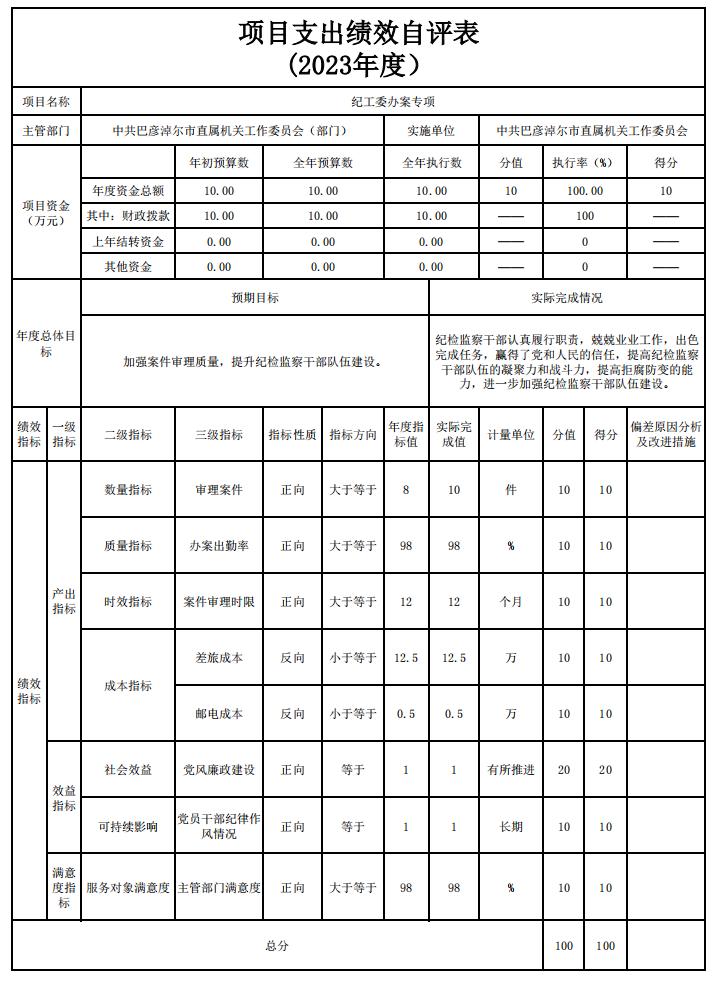 5、纪工委办案项目自评综述:根据年初设定的绩效目标,项目自评得分100分。全年预算数为10万元,执行数为10万元,完成预算的100%。项目绩效目标完成情况:加强案件审理质量,提高纪检监察干部队伍的凝聚力和战斗力,提高拒腐防变的能力,进一步加强纪检监察干部队伍建设。发现的主要问题及原因:无。下一步改进措施:无。