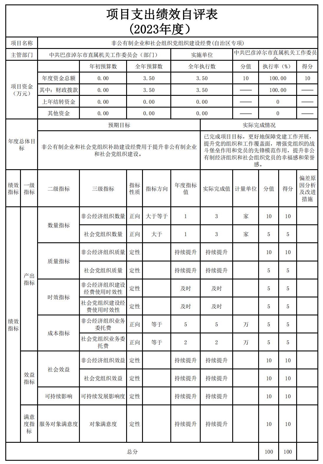 3、非公有制企业和社会组织党组织建设补助资金项目(自治区专项)自评综述:根据年初设定的绩效目标,项目自评得分100分。全年预算数为3.5万元,执行数为3.5万元,完成预算的100%。项目绩效目标完成情况:完成了非公有制企业和社会组织党组织建设补助资金及时支付,提升了非公有制企业和社会组织党组织建设。发现的主要问题及原因:无。下一步改进措施:无。