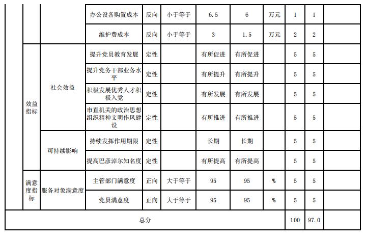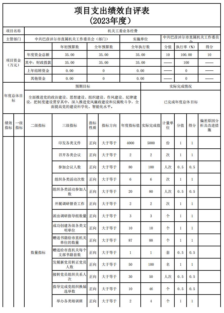4、机关工委业务经费项目自评综述:根据年初设定的绩效目标,项目自评得分97分。全年预算数为35万元,执行数为35万元,完成预算的100%。项目绩效目标完成情况:全面推进党的政治建设、思想建设、组织建设、作风建设、纪律建设,把制度建设贯穿其中,深入推进党风廉政建设和反腐败斗争,全面提高党的建设科学化、智能化水平。发现的主要问题及原因:无。下一步改进措施:进一步完善机关管理制度,强化财务内部管理。积极参与绩效管理工作研讨会、座谈会,加强我单位的绩效管理知识更新和储备,全方位提升我单位预算绩效管理能力。